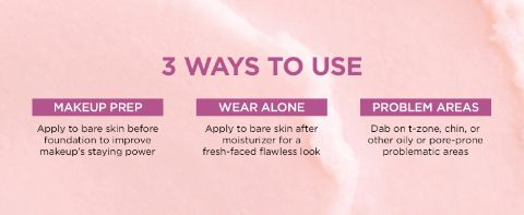 • PODKLADOVÁ BÁZA POD MAKE-UP TVÁRE A OBLASTI POD OČAMI: Naneste na čistú pokožku alebo po úplnom vstrebaní hydratačného krému. Rozotrite pod očami, aby ste vyhladili jemné vrásky, na nos a líca, aby ste minimalizovali vzhľad pórov a škvŕn, do t-zóny pre matný výsledok