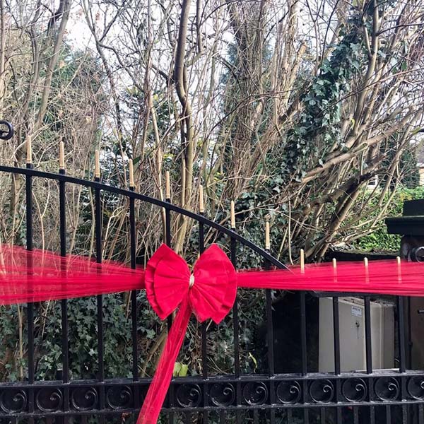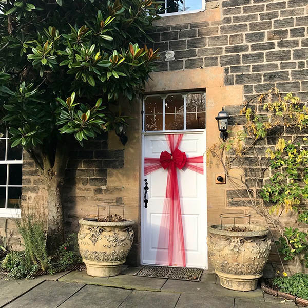 Prevlečte stuhu cez dverové otvory, prekrížte, zaviažte mašľu a zaistite sponkami.