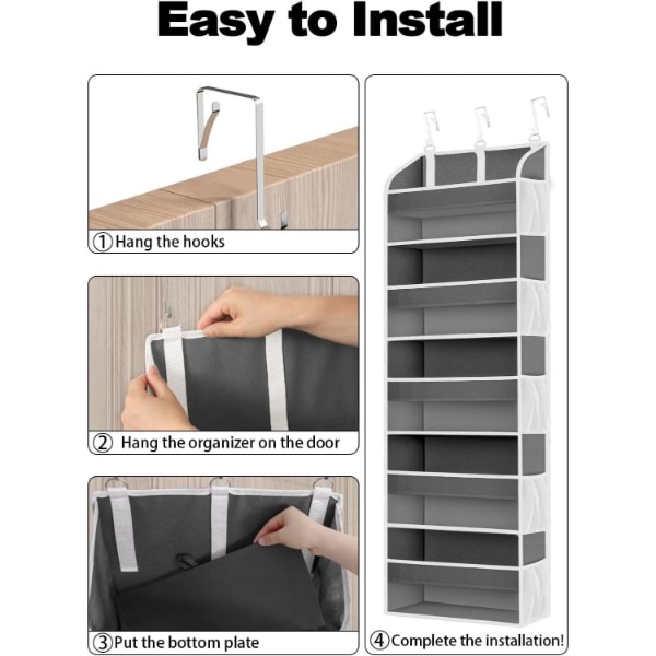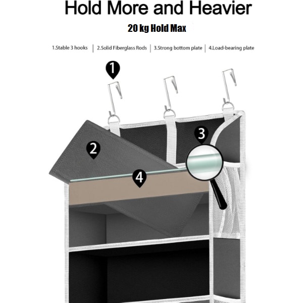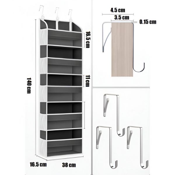 Vybavený 3 nastaviteľnými kovovými háčikmi, tento organizér ľahko pasuje na dvere s hrúbkou až 4 cm.